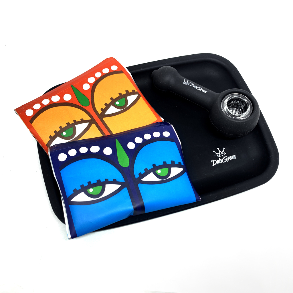 Neste kit, os Kumbayas chegam acompanhados de uma bandeja e pipe de silicone, itens que complementam a sessão.